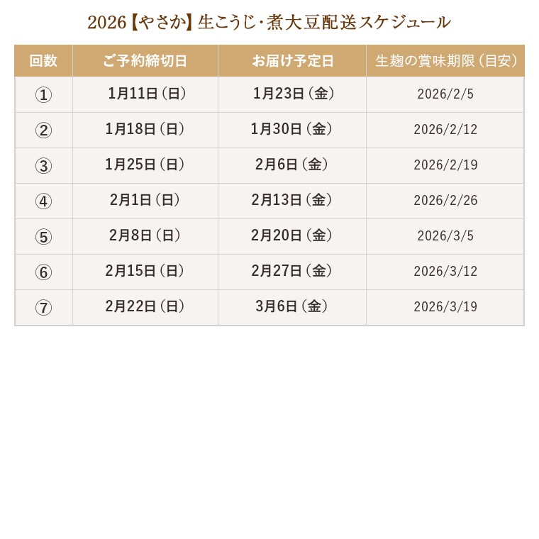 ・生こうじは上記のスケジュール(2枚目)を目安に発送いたします。 必ずご確認ください。