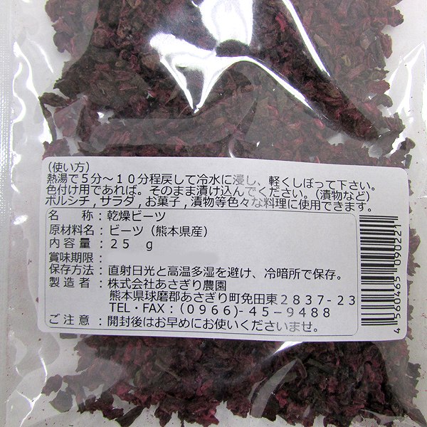 熊本県産のビーツをそのまま乾燥させました。お湯で5?10分戻して冷水に浸すと6?10倍になります。サラダ、スープ、お菓子、漬物などさまざまなお料理にどうぞ。