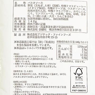 - 国内産大豆から作った挽肉状の大豆ミートと有機トマトを使用した、植物素材100%のパスタソースです。有機トマトの旨みと酸味を有機オリーブオイルとウスターソースで味わい深く仕上げました。