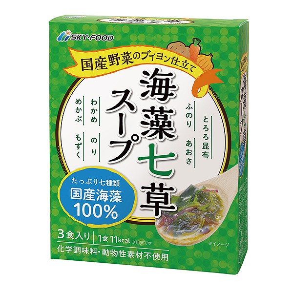 - 彩り豊かな国内産の海藻7種類(昆布、湯通し塩蔵わかめ、乾のり、ふのり、めかぶ、ひとえぐさ、もずく)を具に、国内産野菜の旨みで仕上げた動物性素材不使用のスープです。洋食にも和食にも合います。