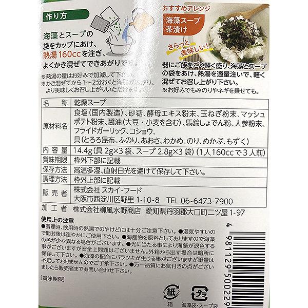 | 原材料 | 食塩、砂糖、酵母エキス、玉ねぎ、じゃがいも、醤油、澱粉、人参、ガーリック、こしょう、昆布、湯通し塩蔵わかめ、湯通し塩蔵昆布、乾のり、ふのり、めかぶ、ひとえぐさ、もずく |