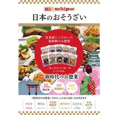 化学調味料・着色料・保存料不使用なのに、常温で1年7か月の長期保存可能なお惣菜のパック商品「uchipac」販売開始から5年たち、日本の食文化を次世代に、世界に繋ぐため、「日本のおそうざい」という国産原材料にこだわりを持って企画した人気の既存のシリーズを材料にこだわってリニューアルしました。