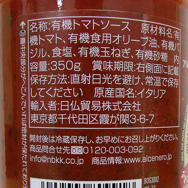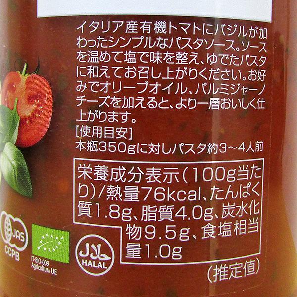 | 原材料 | 有機トマト、有機オリーブ油、有機バジル、食塩、有機玉ねぎ、有機砂糖 |