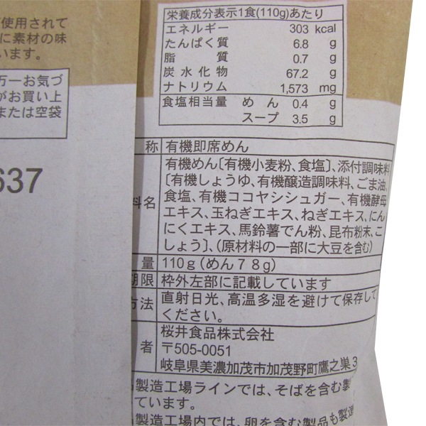 | 原材料 | 有機小麦粉、有機しょうゆ、有機醸造調味料、ごま油、食塩、有機ココヤシシュガー、有機酵母エキス、玉ねぎエキス、ねぎエキス、にんにくエキス、馬鈴薯でんぷん、昆布粉末、こしょう |