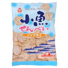- ばれいしょでん粉を主原料とした生地に、小魚の粉末を練りこみました。醤油ベースの味付けでパリッと焼き上げました。ノンフライです。
