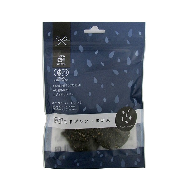 - 有機玄米の生地に香ばしい黒胡麻をたっぷり練り込みました。有機たまり醤油でさっぱりと味付けています。グルテンフリー。シュガーフリー。