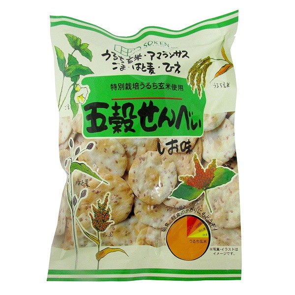 - 国内産特別栽培うるち玄米、アマランサス、白胡麻、はと麦、ひえの5種類の穀物を混ぜ合わせ、独自の火加減で丹念に焼き上げた、しお味のおせんべいです。