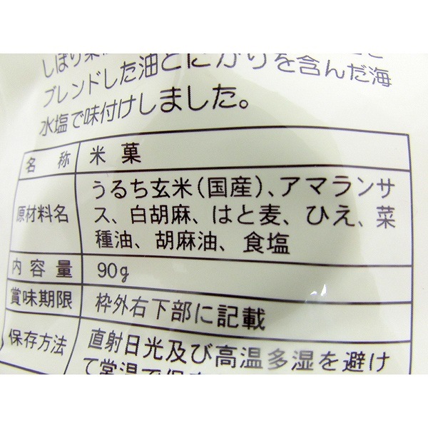 | 原材料 | うるち玄米、アマランサス、白胡麻、はと麦、ひえ、菜種油、胡麻油、食塩 |