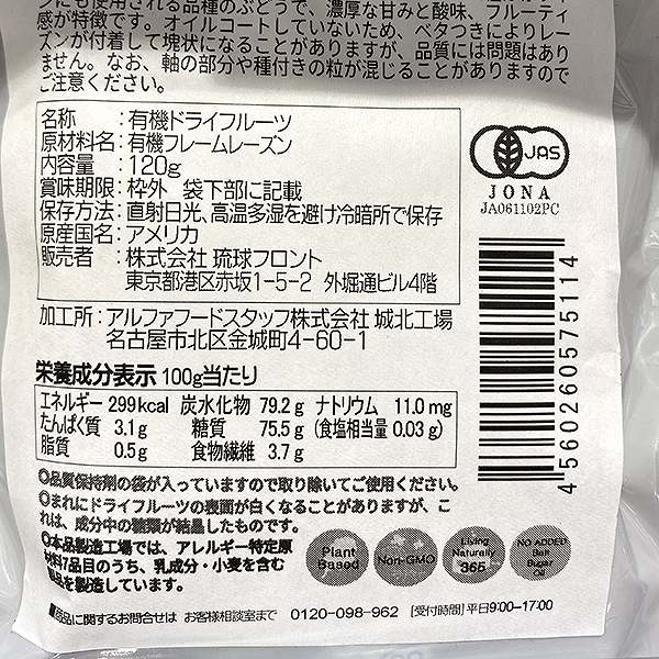 | 原材料 | 有機ジャンボフレームレーズン |
