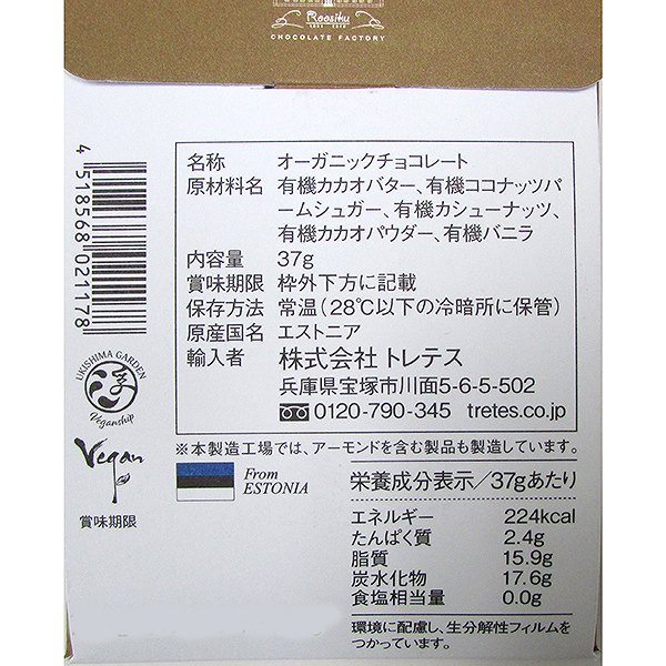 | 原材料 | 有機カカオバター、有機ココナッツパームシュガー、有機カシュ?ナッツ、有機カカオパウダー、有機バニラ |