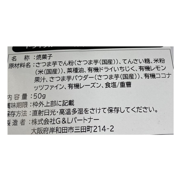 | 原材料 | サツマイモ澱粉、てんさい糖、米粉、菜種油、有機レーズン、有機レモン果汁、有機ドライいちじく、サツマイモパウダー、有機ココナッツパウダー、食塩 |