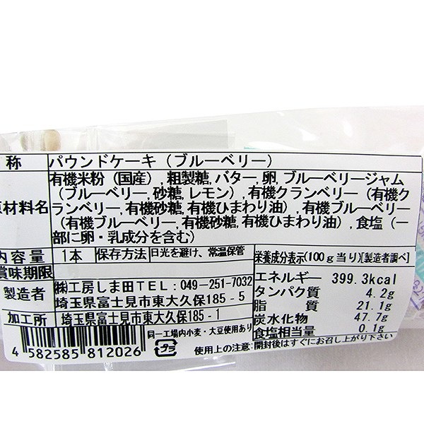 - 国内産有機米粉を主原料に手作りでつくったスティックタイプのパウンドケーキです。ブルーベリージャムを加え、有機クランベリー、有機ブルーベリーをトッピングしました。