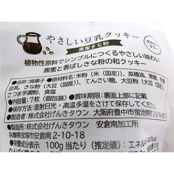 - 国内産米粉、大豆粉、有機豆乳など、植物性素材のみを使用した、グルテンフリークッキー。黒蜜と香ばしきな粉の和風クッキーです。