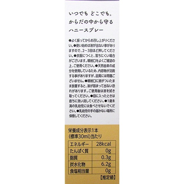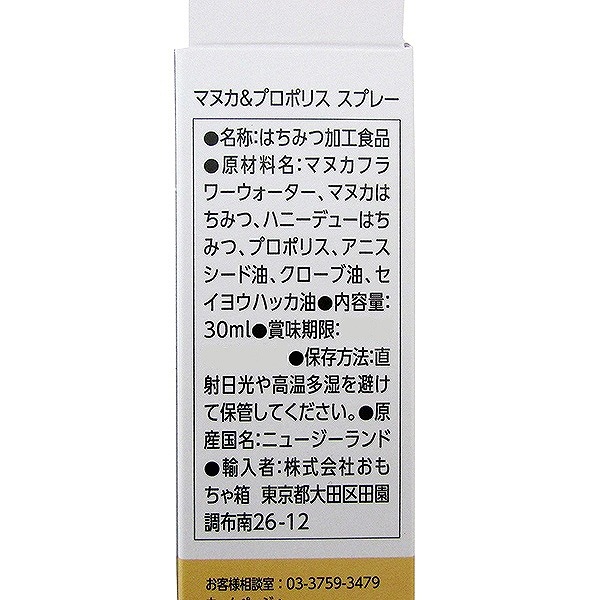 | 原材料 | マヌカフラワーウォーター、マヌカはちみつ、ハニーデューはちみつ、プロポリス、アニスシード油、クローブ油、セイヨウハッカ油 |