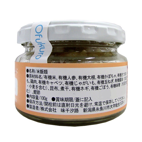 | 原材料 | 有機米、有機人参、有機大根、有機かぼちゃ、有機さつま芋、鶏肉、有機キャベツ、有機じゃがいも、有機玉ねぎ、有機ごぼう、有機ねぎ、有機醤油、昆布、煮干し、鰹節 |