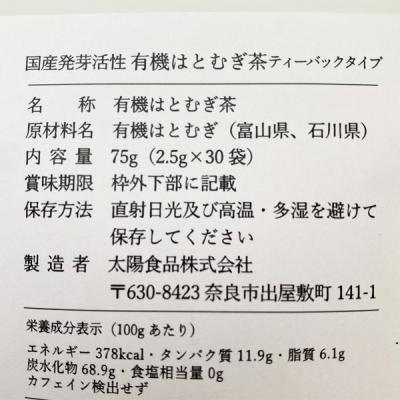 国産発芽活性有機ハトムギ茶 T/B 2.5g×30・1袋