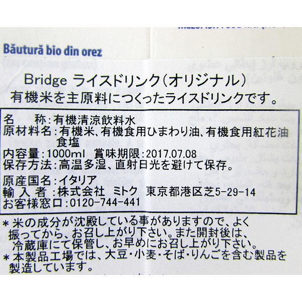 - イタリア産の有機米から作ったライスドリンクです。お米の甘みと、さっぱりとした味わいが特徴。そのままでも、ミューズリー・シリアル等にかけて食べるのもおすすめです。
