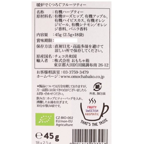 | 原材料 | 有機ローズヒップ、有機アップル、有機ハイビスカス、有機オレンジピール、有機シナモン/オレンジ香料、バニラ香料 |