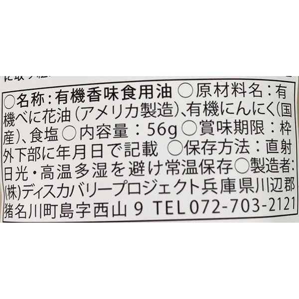 | 原材料 | 有機べに花油(アメリカ)、有機にんにく(兵庫)、食塩 |