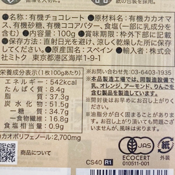 | 原材料 | 有機カカオマス、有機砂糖、有機ココアバター、食塩 |