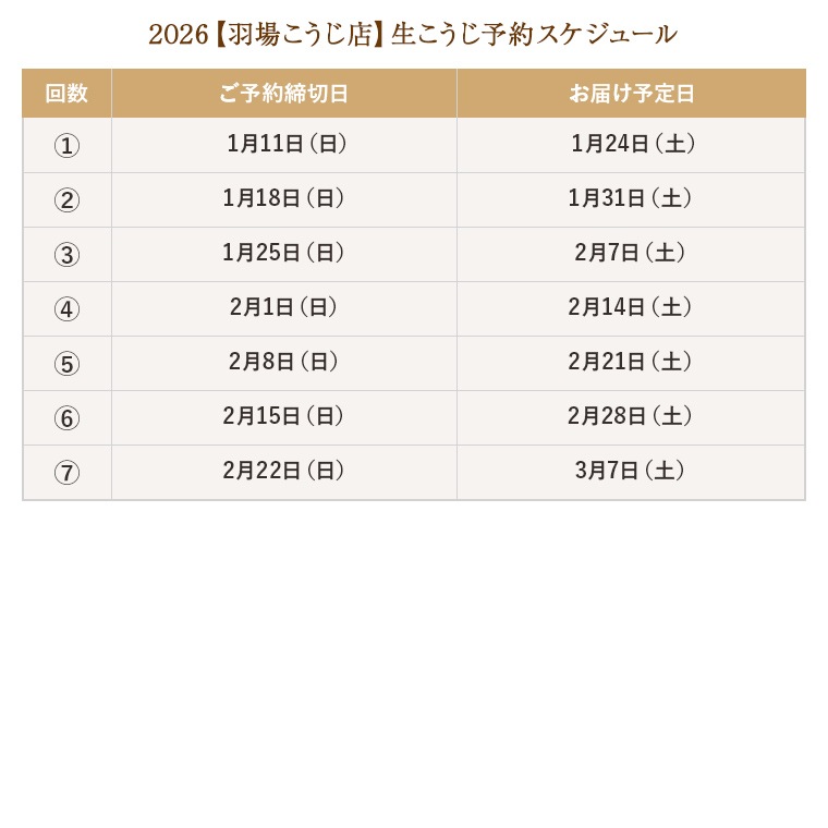 ・生こうじは上記のスケジュール(2枚目)を目安に発送いたします。 必ずご確認ください。
