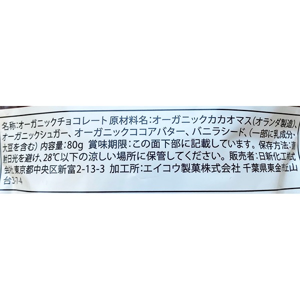 | 原材料 | オーガニックカカオマス、オーガニックシュガー、オーガニックココアバター、バニラシード |