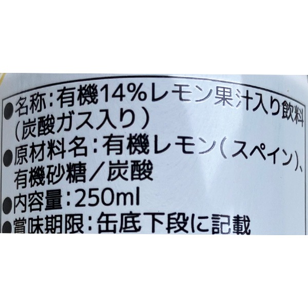| 原材料 | 有機レモン(スペイン)、有機レモン濃縮ピューレ(スペイン)、有機砂糖(ブラジル)、炭酸(国産) |
