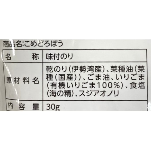 | 原材料 | 乾ばら海苔(伊勢湾)、食用なたね油(米澤製油)、食用ごま油、有機白いりごま(和田萬)、食塩(海の精)、スジアオノリ(国産) |