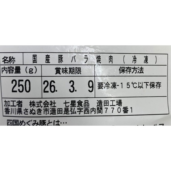 四国めぐみ豚バラ 焼肉 250g・1袋