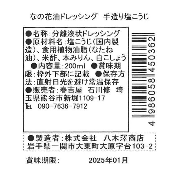 なの花油ドレッシング 塩こうじ 200ml・1本
