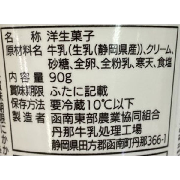 | 原材料 | 牛乳(静岡県産生乳)、クリーム、砂糖、全卵、全粉乳、寒天、食塩 |