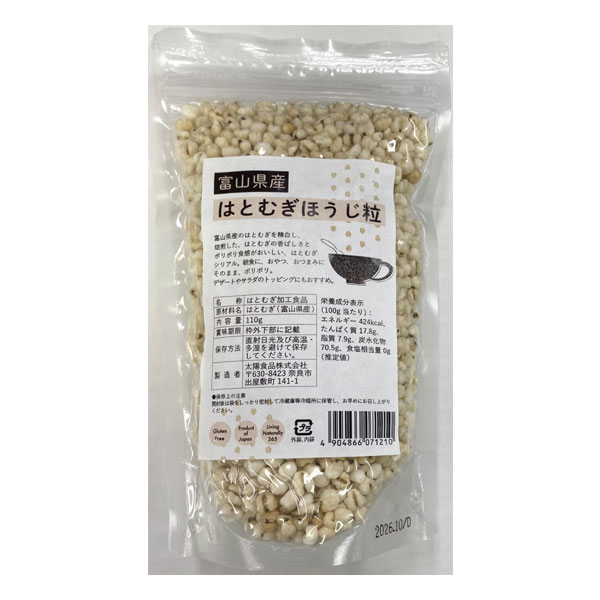 - 富山県産のはとむぎを精白し焙煎しています。はとむぎの香ばしさと、ポリポリとした食感で、お茶請けや、お子様のおやつにもぴったりです。デザートやサラダのトッピングにもどうぞ。